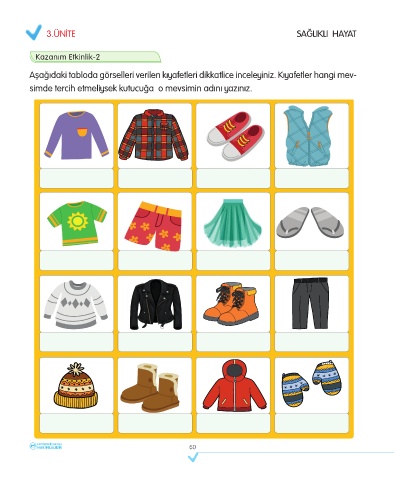 3.ÜNİTE SAĞLIKLI HA Y A T 3.ÜNİTE SAĞLIKLI HAYAT Kazanım Etkinlik-2 Aşağıdaki tabloda görselleri verilen kıyafetleri dikkatlice inceleyiniz. Kıyafetler hangi mev- simde tercih etmeliysek kutucuğa o mevsimin adını yazınız. 60