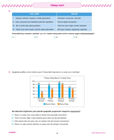 9. Aşağıdaki grafikte roman türlerine göre Türkiye’deki kitap basım ve satış oranı verilmiştir.